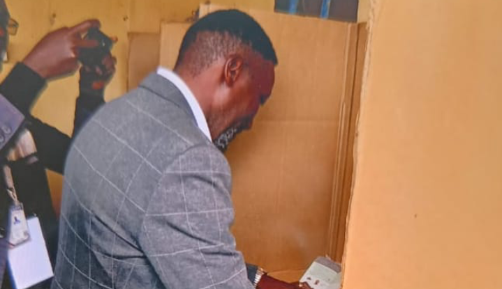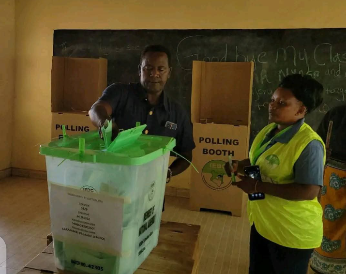 Mwaniaji wa kiti cha eneo bunge la Mbeere Kaskazini Leonard Wamuthende akipiga kura katika kituo cha Siakago Social hall.