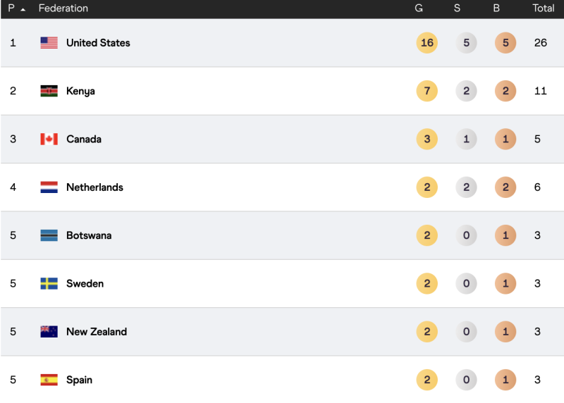 Marekani ilitwaa ubingwa kwa medali 16 za dhahabu fedha 5 na shaba 5.